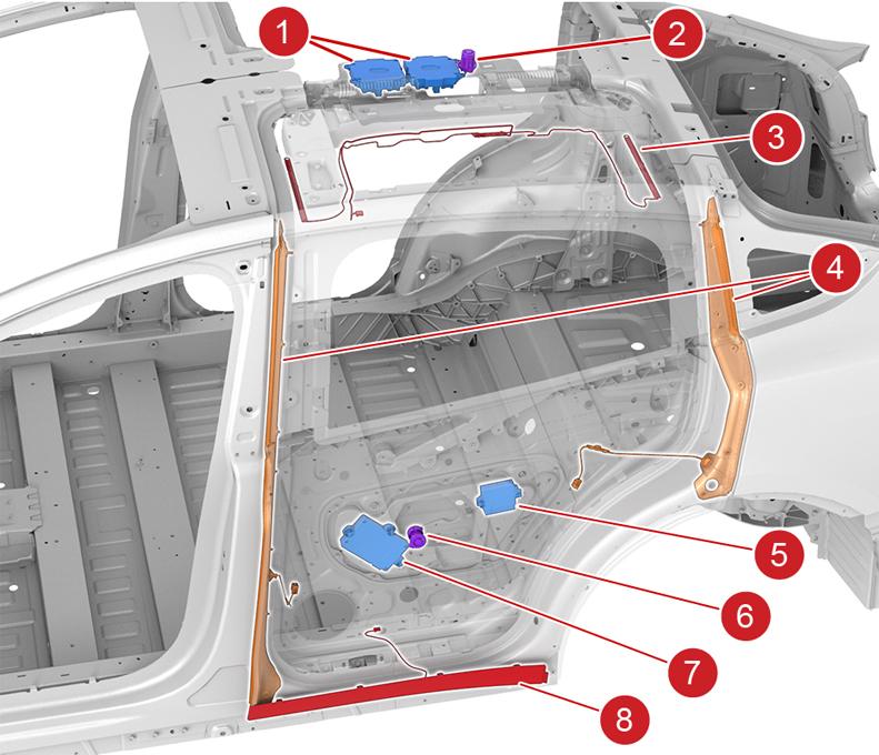 | 1. Rear door electromechanical controllers (1 per door, 2 total) 2. Spine ultrasonic sensor (1 total) 3. Falcon door inductive pinch sensor and ECU 4. Lower door pinch strips (2 per door, 4 total) 5. Ultrasonic ECU (1 total, in LH door) 6. Door ultrasonic sensor (1 per door, 2 total) 7. Rear door controller (1 per door, 2 total) 8. Rear door cladding assembly with capacitive sensor (1 per door, 2 total) |