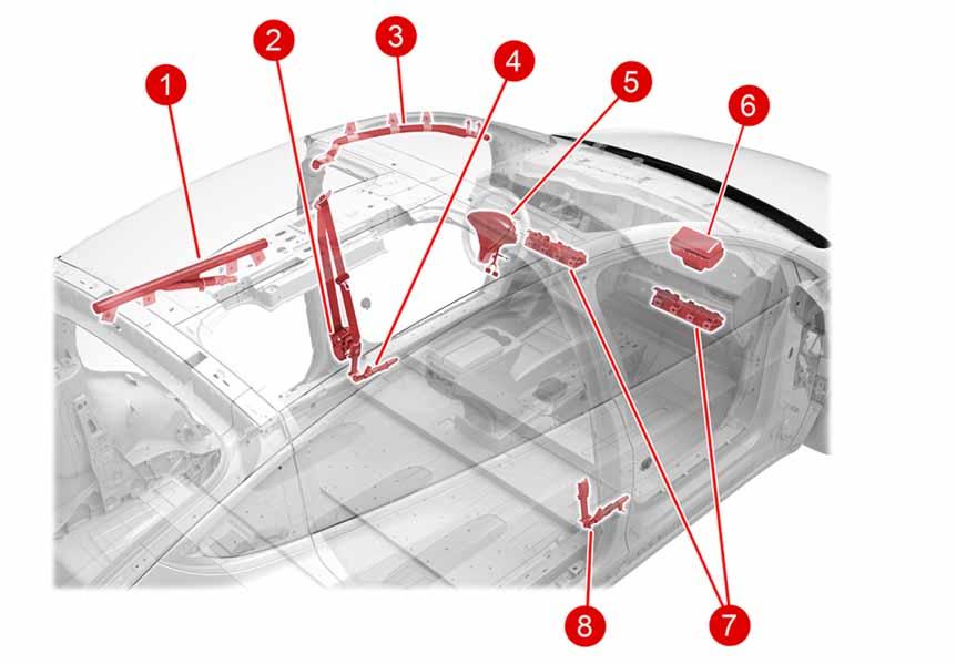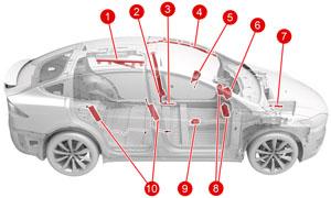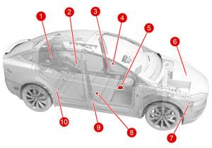 Eight acceleration type impact sensors are fitted to the Model X in the following positions: