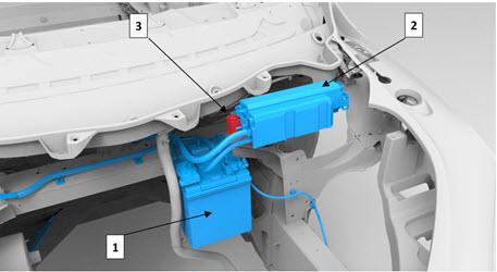 The pyrotechnic fuse F93 is located on the battery fuse box. The fuse cuts 12V contactor power, which forces the HV battery contactors to open. The RCM fires the fuse anytime the airbags and/or pretensioners deploy. Pyrotechnic fuse deployment isolates high voltage to the HV Battery, which makes the vehicle safe for the occupants and emergency responders if the high voltage system is compromised by collision damage.