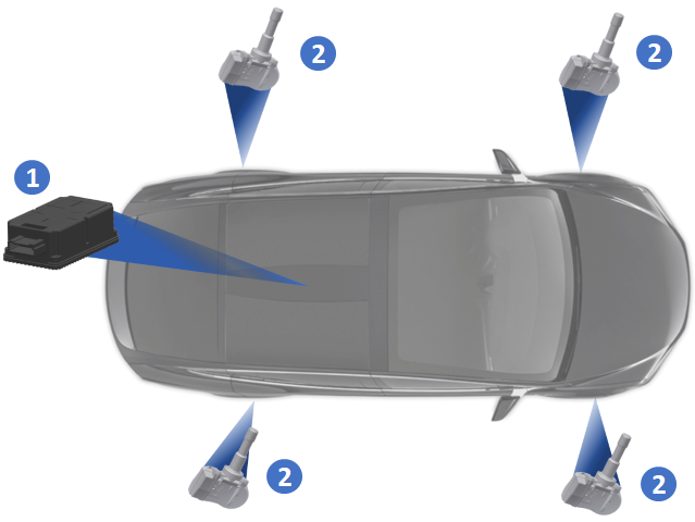 | 1. TPMS Control Unit (MCU) 2. TPMS Wheel Sensor |