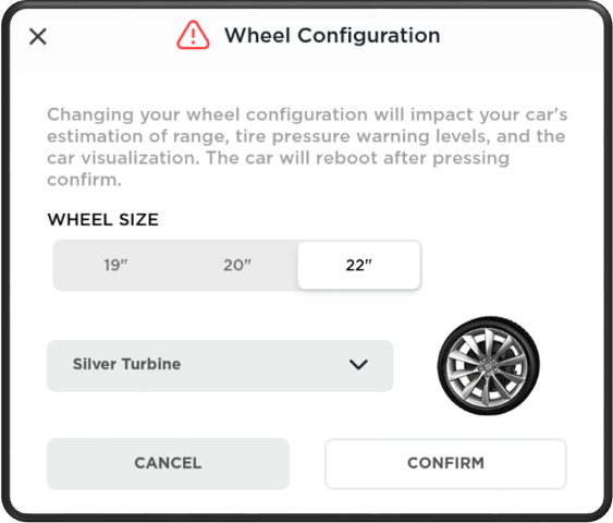 Vehicles running firmware versions earlier than 2019.32.X and have an incorrect wheel configuration should be updated to the latest firmware version or have the wheel configuration changed with a Toolbox routine.