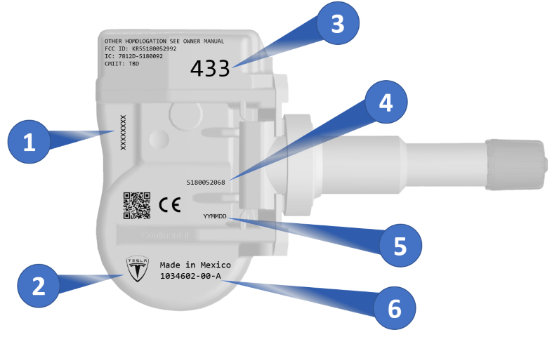 | 1. TPMS ID (ID that TPMS uses to identify the Wheel Sensor) 2. Tesla Logo 3. Frequency value 433/315Mhz 4. Continental Product Reference 5. Date of production 6. Tesla part number |