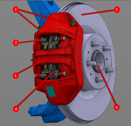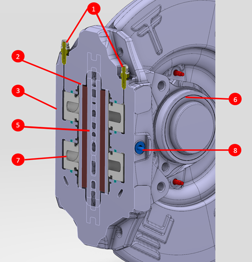 | 1. Brake Fluid bleed nipples 2. Brake Pad 3. Brake Caliper Body 4. Brake Pad anti-rattle clip 5. Brake Rotor 6. Hub (incorporates Wheel Speed Sensor Tone Ring) 7. Brake Piston (x4) 8. Brake Flexible Pipe connection |