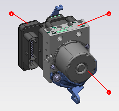 | 1. ESP ECU housing the processor and valve driver electronics 2. Valve block, containing the hydraulic valves and accumulators 3. ESP pump motor |