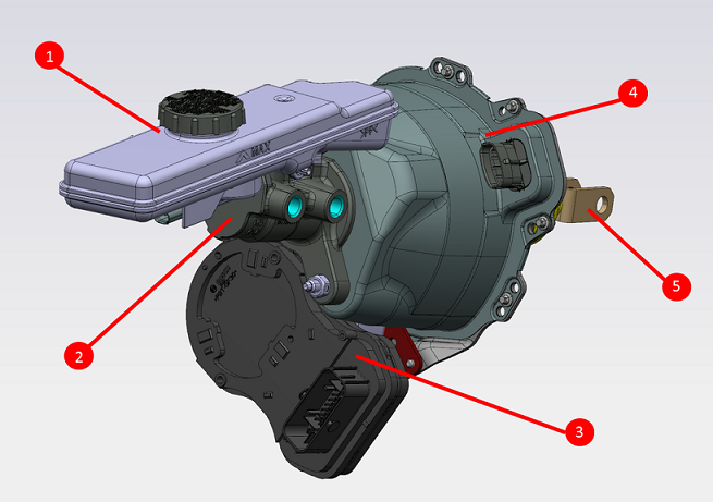 | 1. Brake Fluid Reservoir 2. Tandem Master Cylinder (TMC) 3. Booster Powerpack ECU 4. Booster Gear Housing Assembly 5. Input Rod |