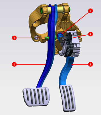 | 1. Brake Pedal Clevis Pin 2. Brake Pedal 3. Brake Switch 4. Accelerator Pedal Sensor Housing 5. Accelerator Pedal |