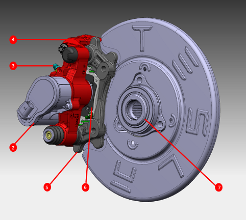 | 1. Brake Rotor 2. Electronic Park Brake (EPB) 3. Single Bleed Nipple 4. Brake Caliper Body 5. Brake Caliper Carrier 6. Brake Pad 7. Hub (incorporates Wheel Speed Sensor Tone Ring) |