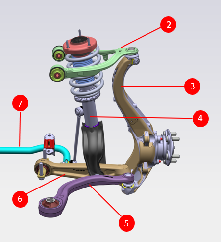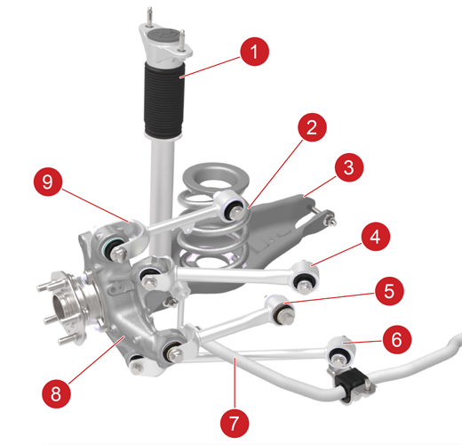 | 1. Damper 2. Spring 3. Lower compliance link 4. Upper fore link 5. Toe link 6. Lower lateral link 7. Stabar 8. Knuckle 9. Upper aft link |