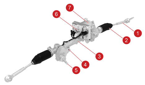 | 1. Outer tie rod 2. Inner tie rod 3. Steering rack 4. Torque sensor 5. Input shaft 6. ECU 7. Motor |