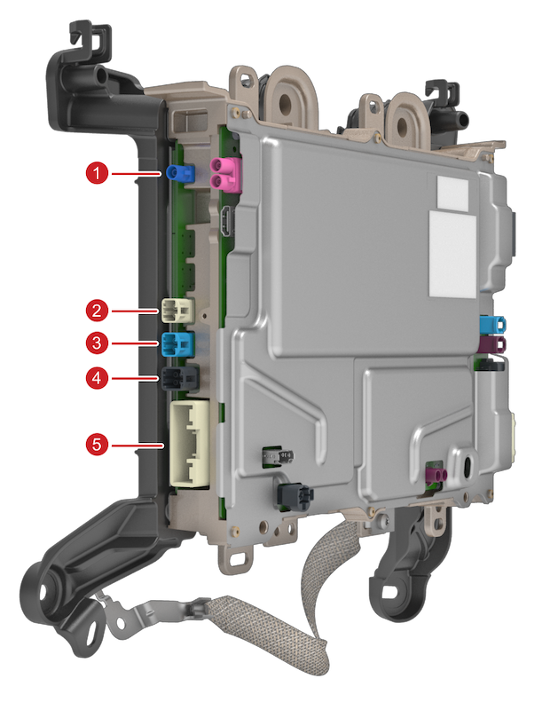 | 1. GNSS Antenna 2. Side repeater cameras (dual connector) 3. Cabin camera and forward-facing fisheye camera (dual connector) 4. Rear-view camera, forward-facing main camera, and B-pillar cameras (quad connector) 5. B-side power (Audio and CAN) |