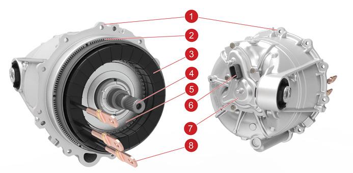 | 1. Stator Housing 2. Stator Steel 3. Stator Windings 4. Rotor Shaft 5. Rotor Balance Ring 6. Resolver 7. Resolver Cover 8. 3-Phase Lugs |