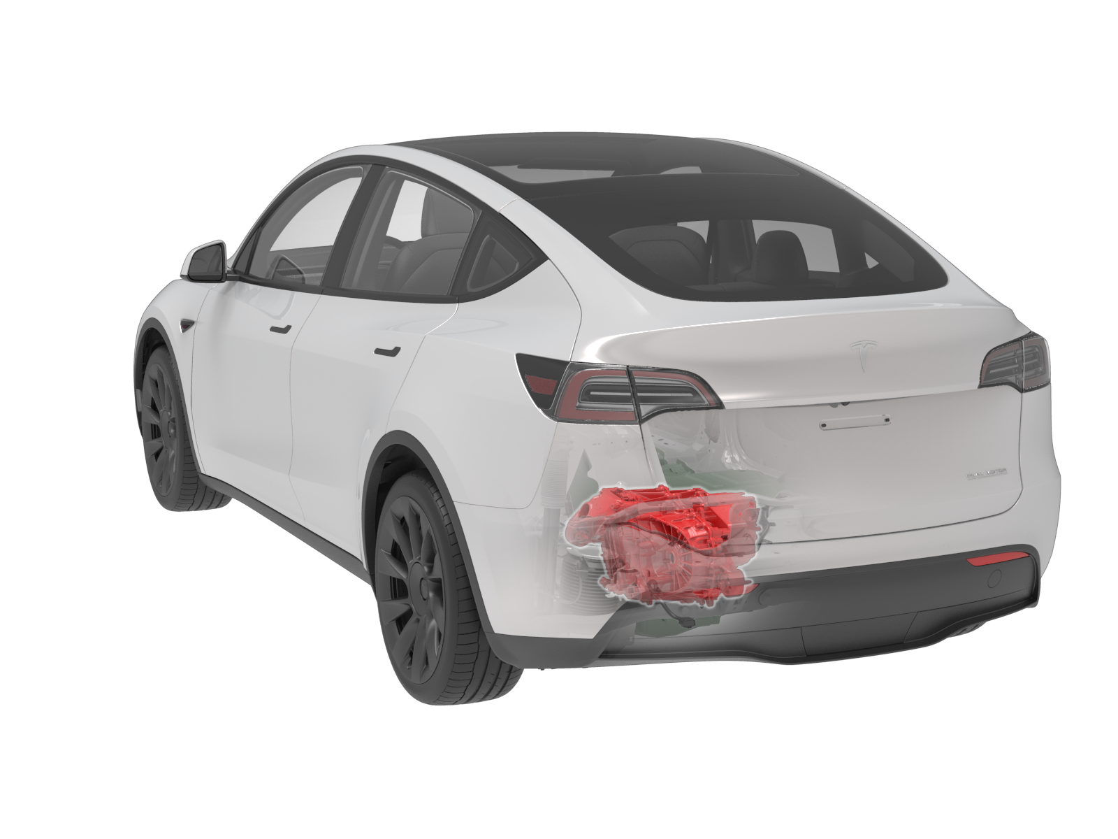 The rear drive unit is located between the rear wheels, underneath the trunk. The half-shafts connect the wheels to the drive unit. The rear drive unit assembly is mounted to the rear sub-frame with three mounts: (1) a rear mount, integrated into the gearbox case, (2) a right mount, integrated into the motor housing, and (3) a left mount, bolted on the gearbox housing above the drive inverter.