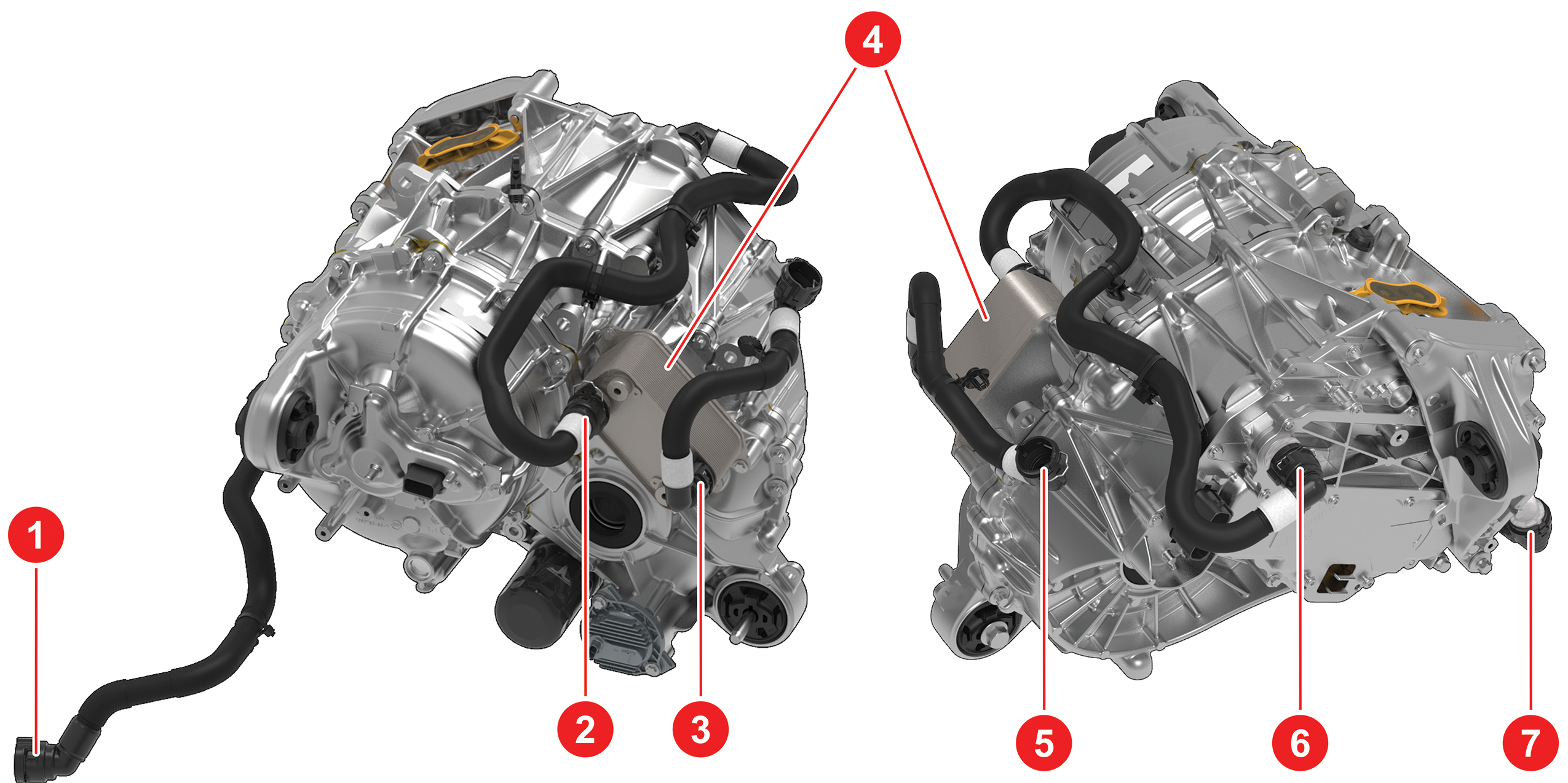 | 1. Rear Subframe Coolant Inlet 2. Heat Exchanger Inlet 3. Heat Exchanger Outlet 4. Heat exchanger 5. Front Subframe Coolant Outlet 6. Drive Inverter Coolant Outlet 7. Drive Inverter Coolant Inlet |