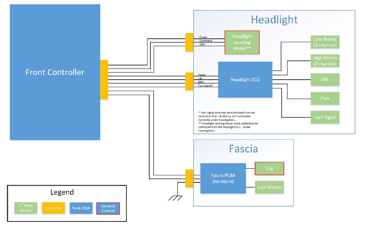 In late 2020, Global Headlamp was introduced for front and rear lights. Before that, two main lighting variants existed (SAE and ECE) to comply with market specific regulations, with regional exceptions in lighting behaviors in Canada (SAE) and Japan (ECE). SAE and ECE variants have different part numbers, while regional exceptions are administered via firmware. With Global Headlamp, regional differences can be recognized by software and the same hardware is used worldwide. Operation of the exterior lights is controlled by the three main vehicle controllers (Front, Left, Right). As with other low voltage components in Model Y, the exterior lights utilize electronic fuses incorporated into the vehicle controllers. The exterior lights respond to requests from: