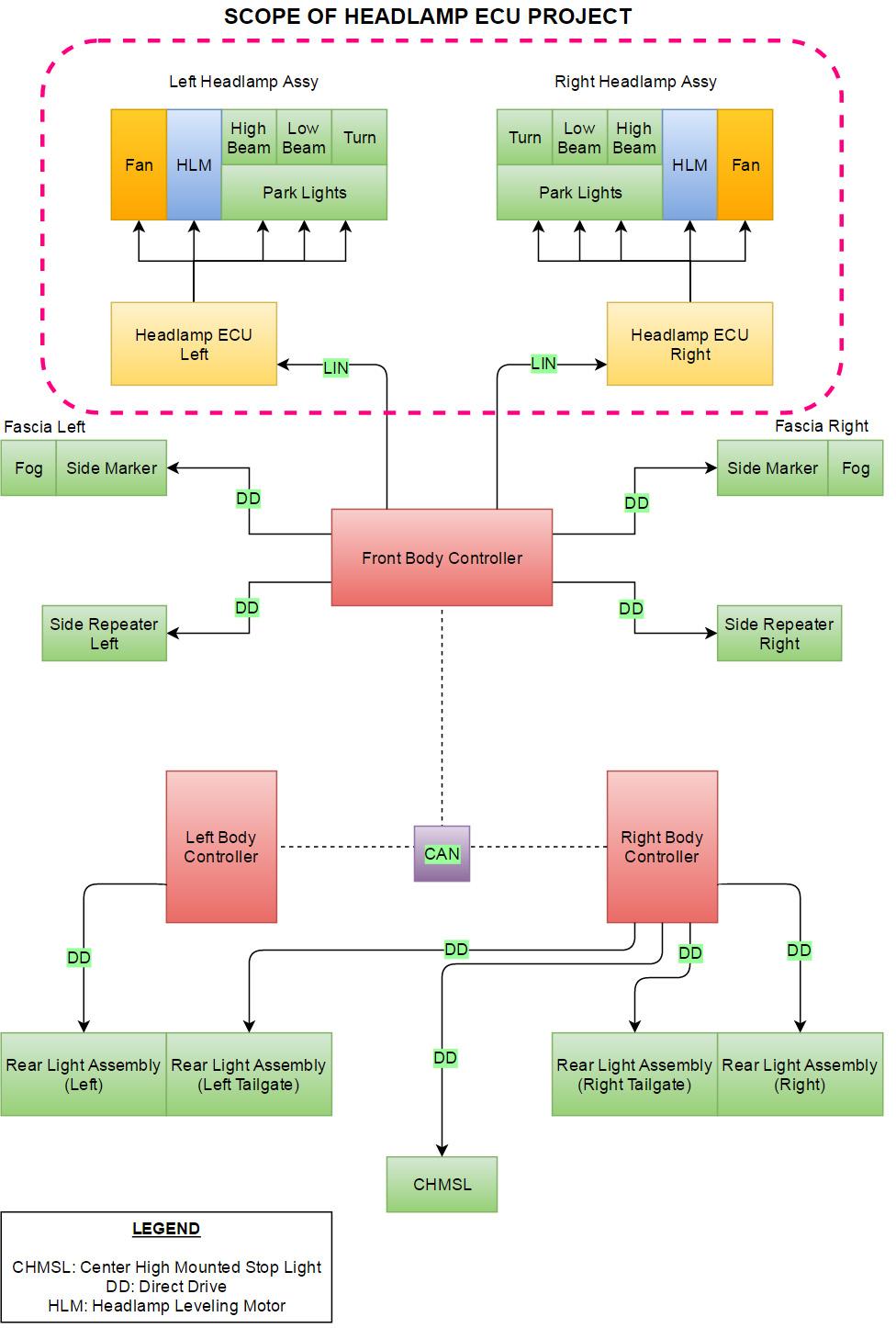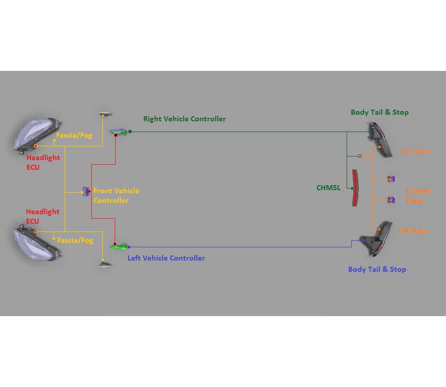The exterior lighting system control is distributed between the vehicle controllers as depicted in the diagram below. The front headlamps have their own ECU, discussed later. The rear lights consist of the body and lift gate tail and stop lights as well as the license plate lights. They are managed by the left and right body controllers.