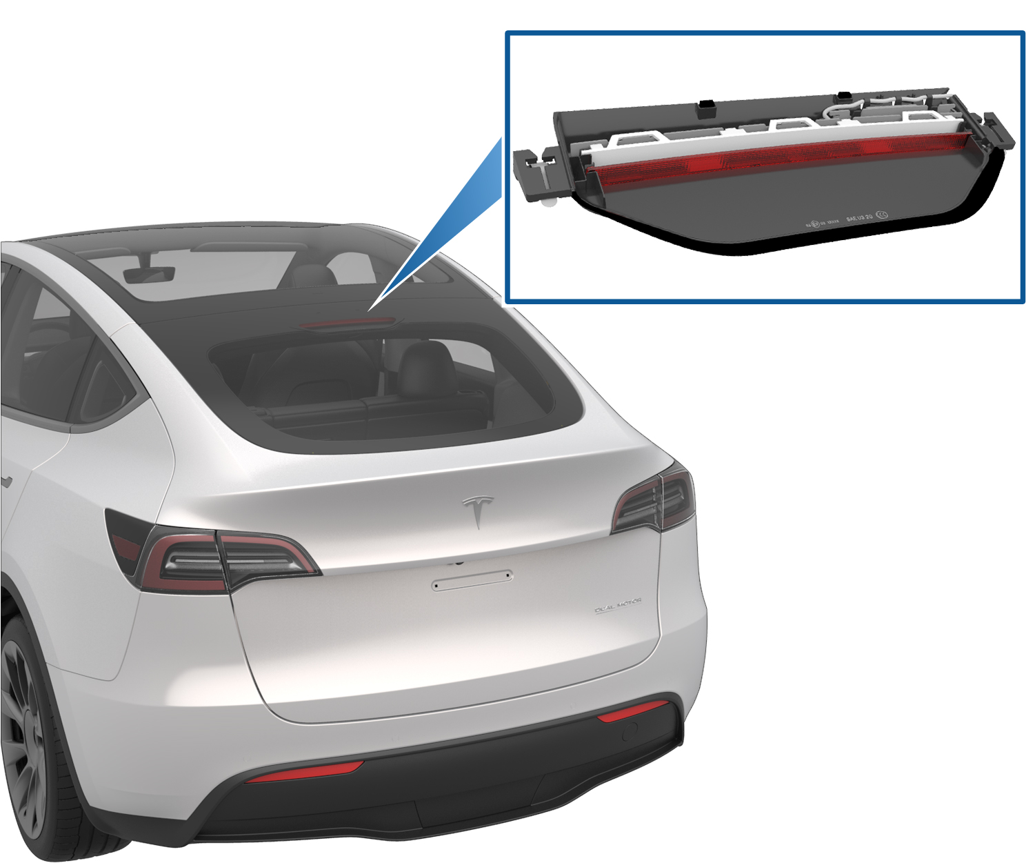The center high mounted stop light is part of the rear liftgate glass, situated between the closure in white and the glass on Model Y. The assembly must be replaced as an assembly. Individual components (LEDs) are not serviceable.