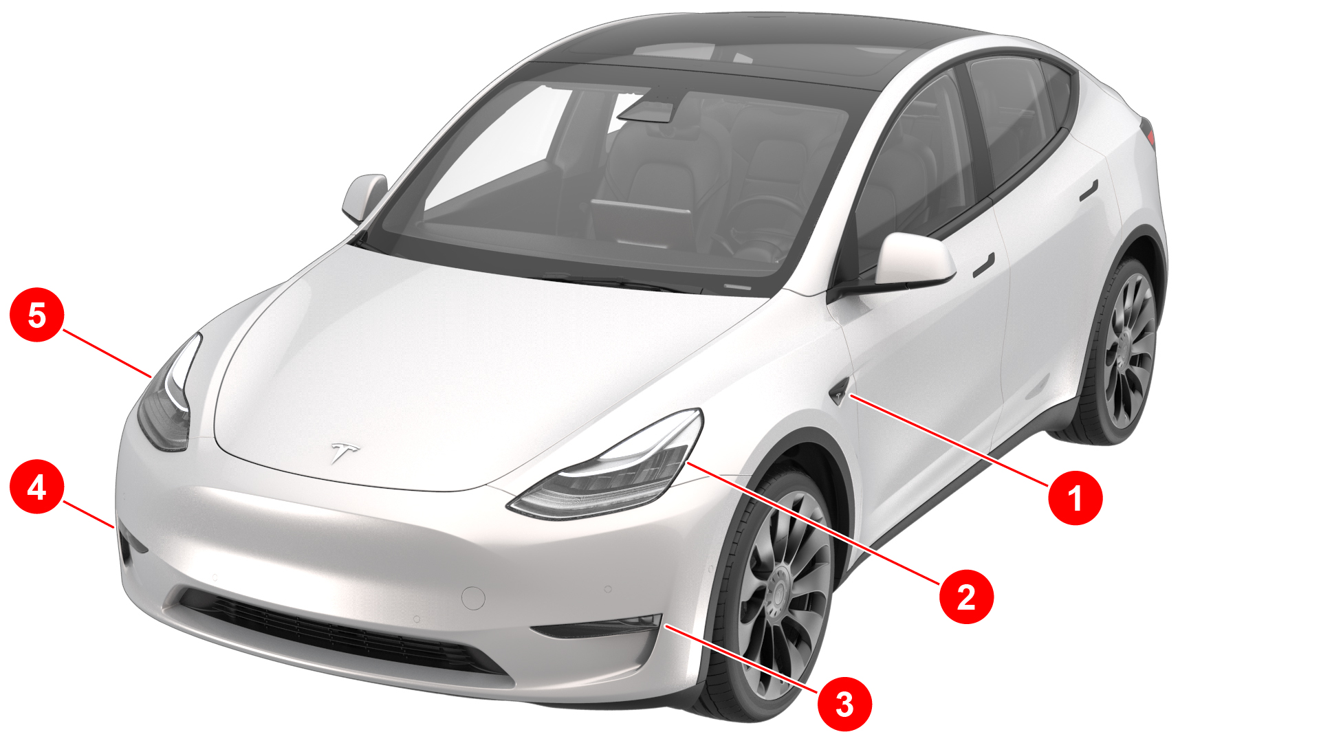 | 1. Side repeater camera assembly (left) 2. Headlamp assembly (left) 3. Fascia light assembly (left) 4. Fascia light assembly (right) 5. Headlamp assembly (right) |