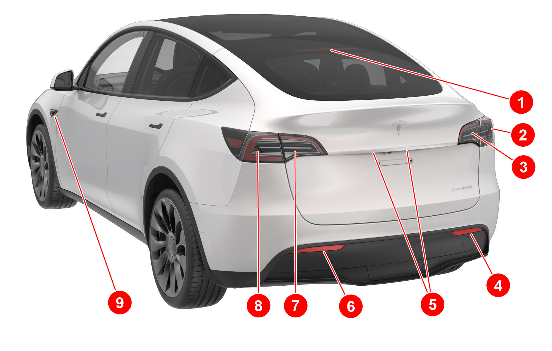 | 1. Center high mounted stop light (CHMSL) 2. Body tail light 3. Liftgate tail light 4. Reflex reflector 5. License plate light 6. Reflex reflector 7. Lift gate tail light 8. Body tail light 9. Side repeater camera assembly |