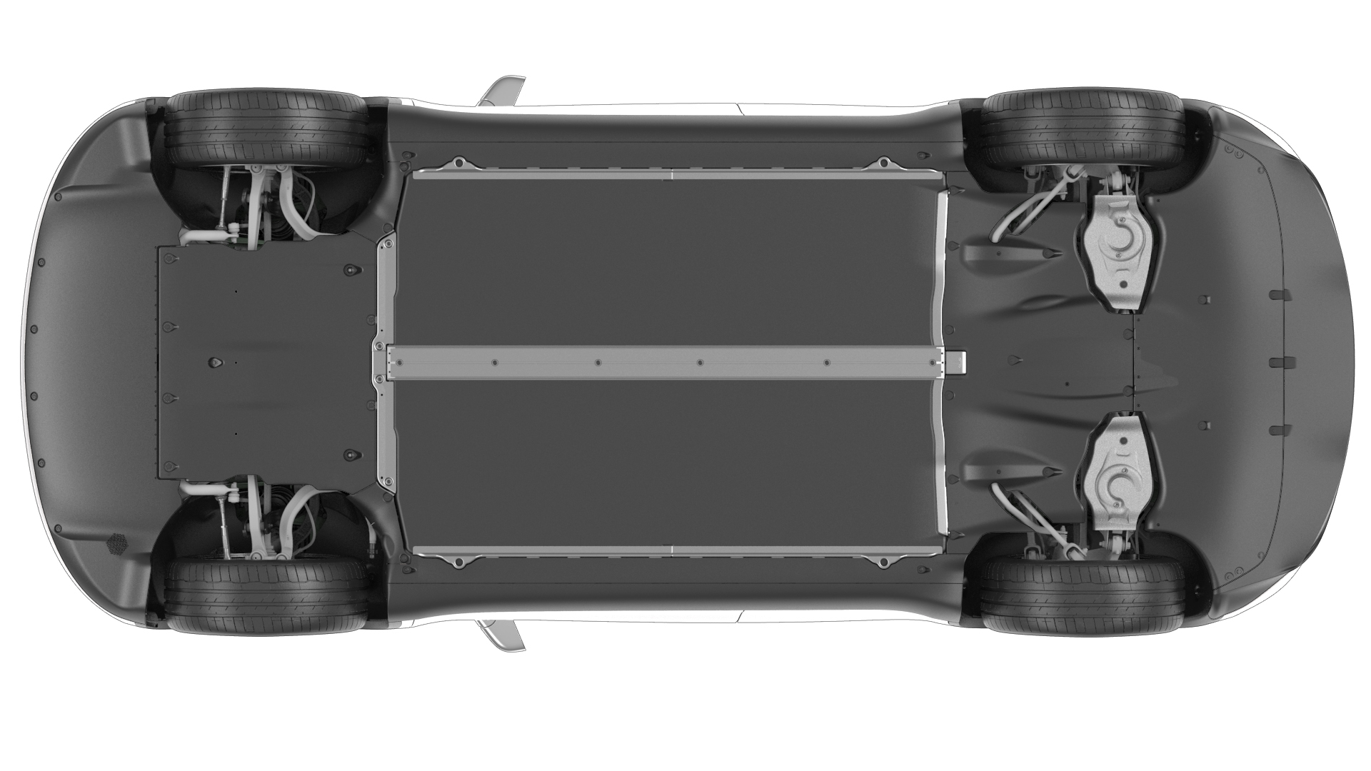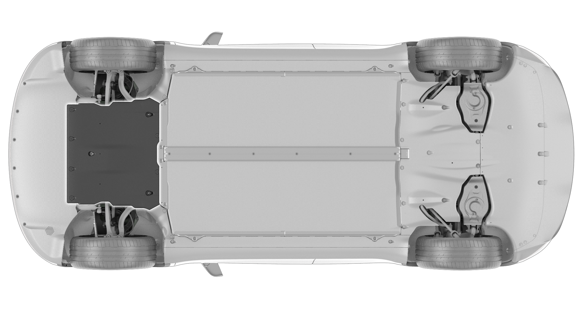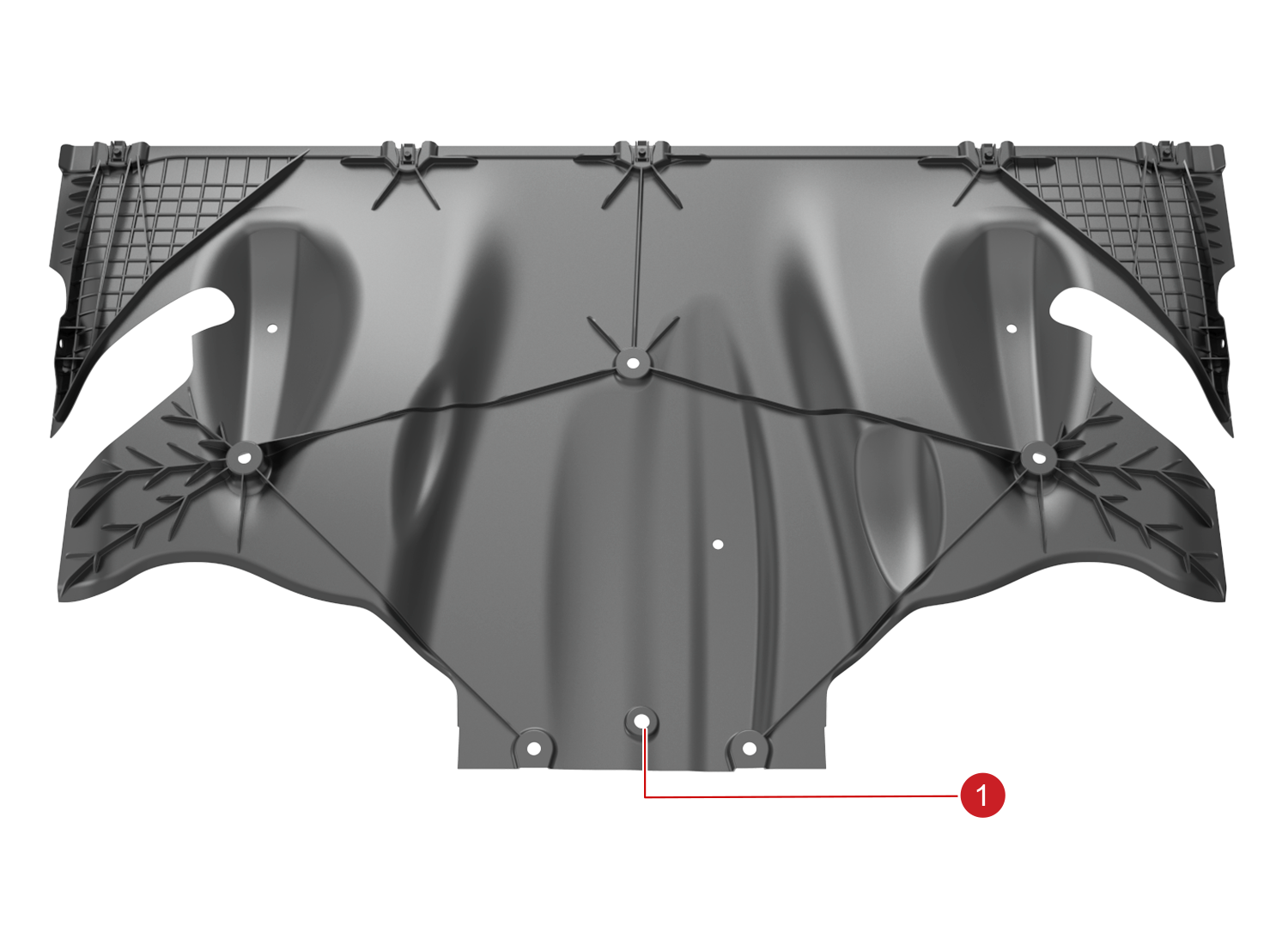 Model Y vehicles built with structural pack have front and mid aero shields to accommodate the smaller battery enclosure. The front aero shield is longer in the Y-direction towards the rear of the vehicle to meet the battery pack. There are 5 skid plate bolts along the rear of the aero shield that mate the aero shield to the vehicle, along with two push pins. There are hanger features along the rear edge of the aero shield, which aid in installation. There are U-nuts in the wheel liners to help support the aero shield during wade events. The outer front corner mounting holes of the aero shield are precision mating holes while the rest of the holes are oversized to allow for slight variation.