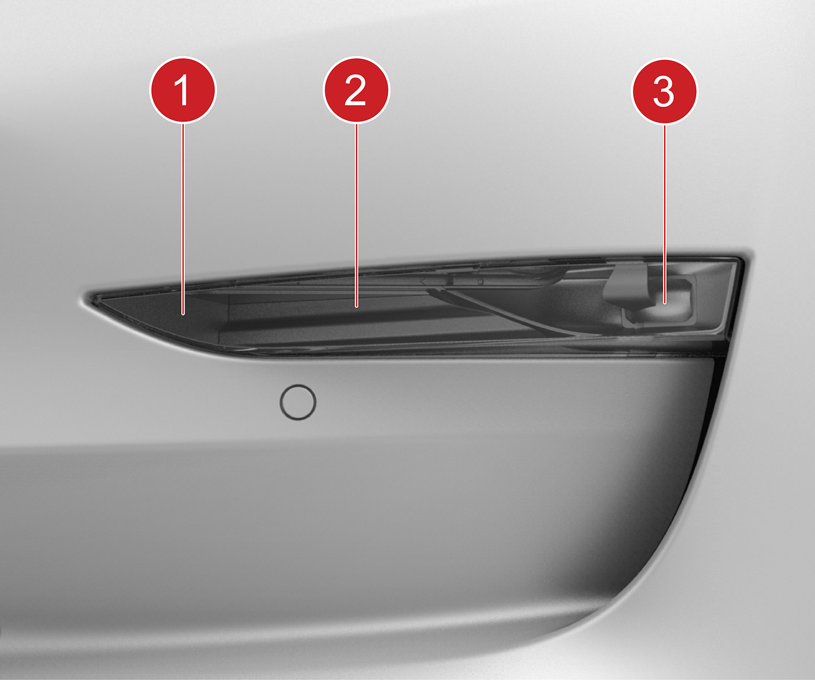 | 1. Side marker - SAE markets only 2. Auxiliary Park (fog light guide for ECE markets) 3. Fog light (fog lens ECE) |