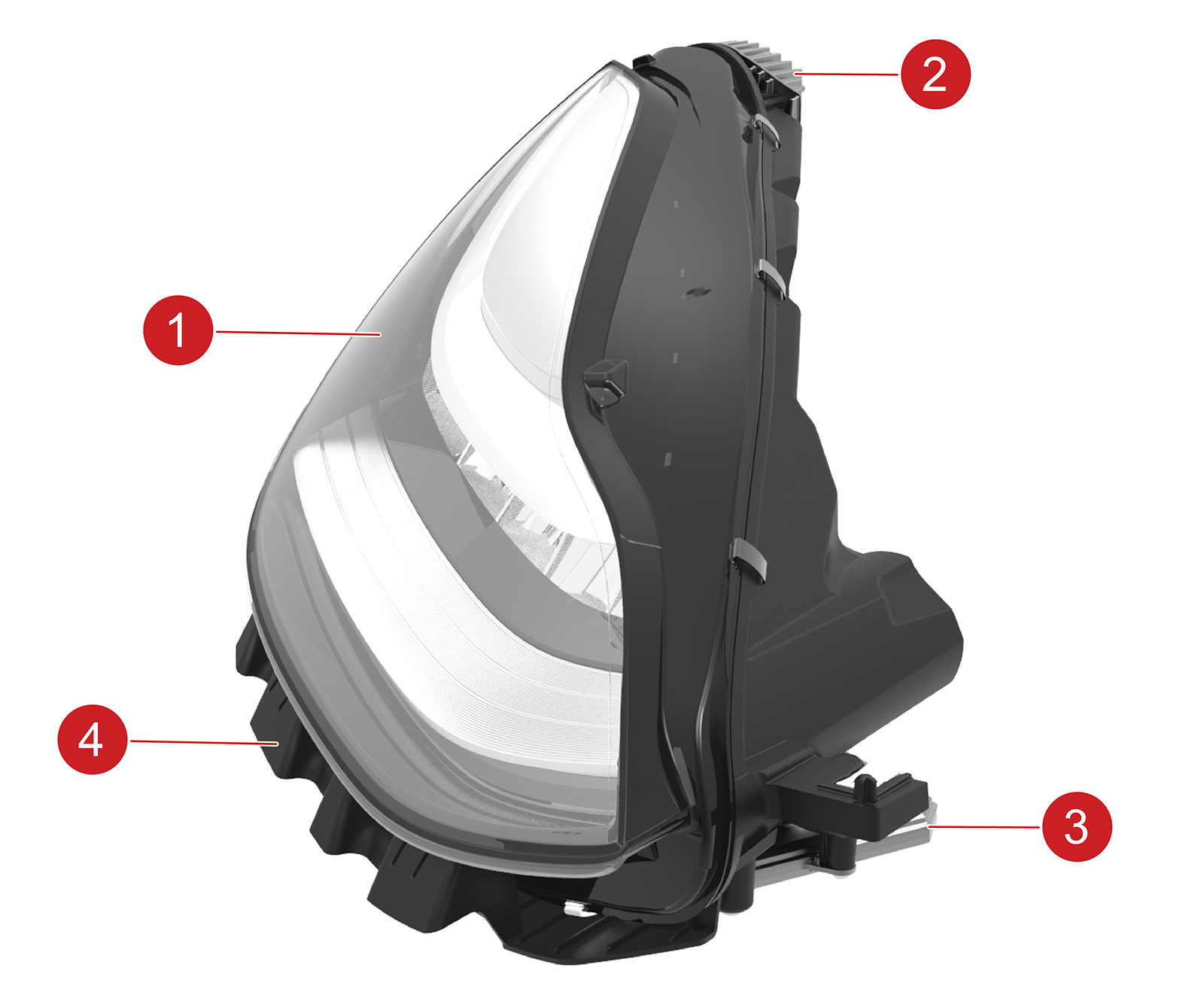 | 1. Headlamp 2. Upper mounting bracket 3. Headlamp ECU 4. Lower mounting bracket |