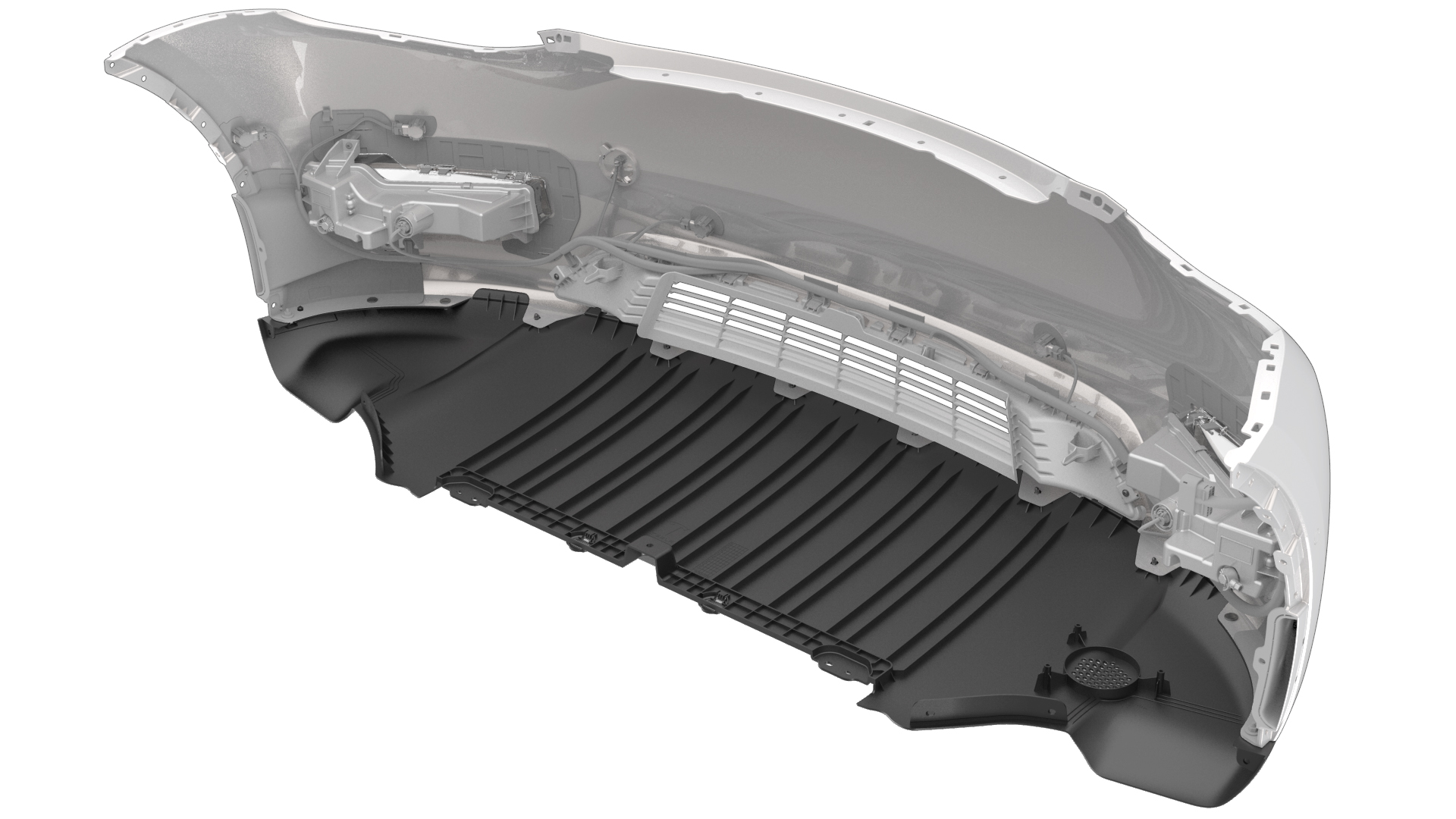 To reduce drag, the design of the Model Y underbody uses molded plastic paneling that prevents air turbulence. Front to rear, the system begins at the front bumper fascia. Air for cooling and ventilation flows through the grill, which has active shutters to manage mass flow. Air then flows beneath the front valence, which is attached to the front bumper fascia with push-pull plastic rivet clips.