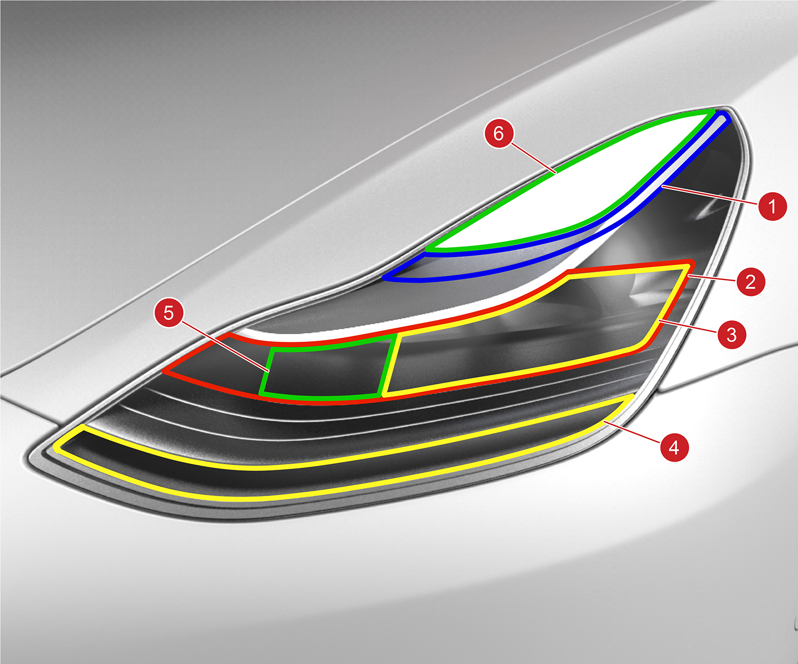 | 1. Park / Signature light guide 2. Premium low beam (red) 3. Base low beam (yellow) 4. Amber turn 5. High beam 6. Park / Signature diffuse |