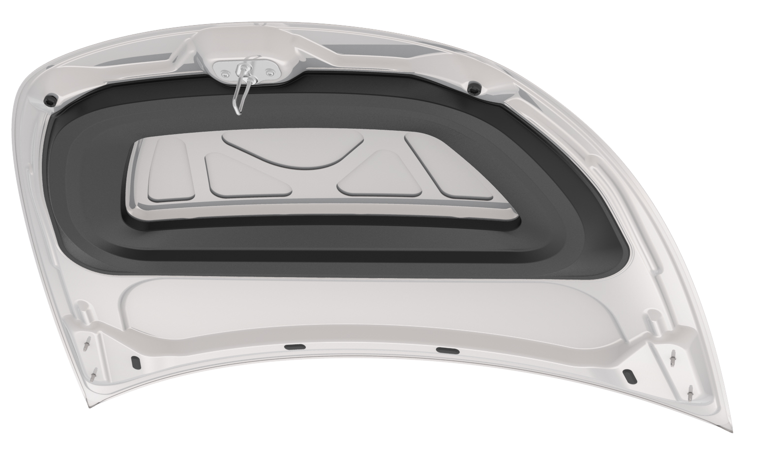 The intent of the hood baffle is to improve performance for Pedestrian Protection. The hood baffle maintains frunk sealing capabilities while providing compliance, in case of a head impact event. Model Y has a baffle that attaches to the underside of the hood. The baffle is made up of both a hard and soft shot portion. The hood baffle meets with the frunk in order to form a seal, keeping contents of the frunk a dry zone.