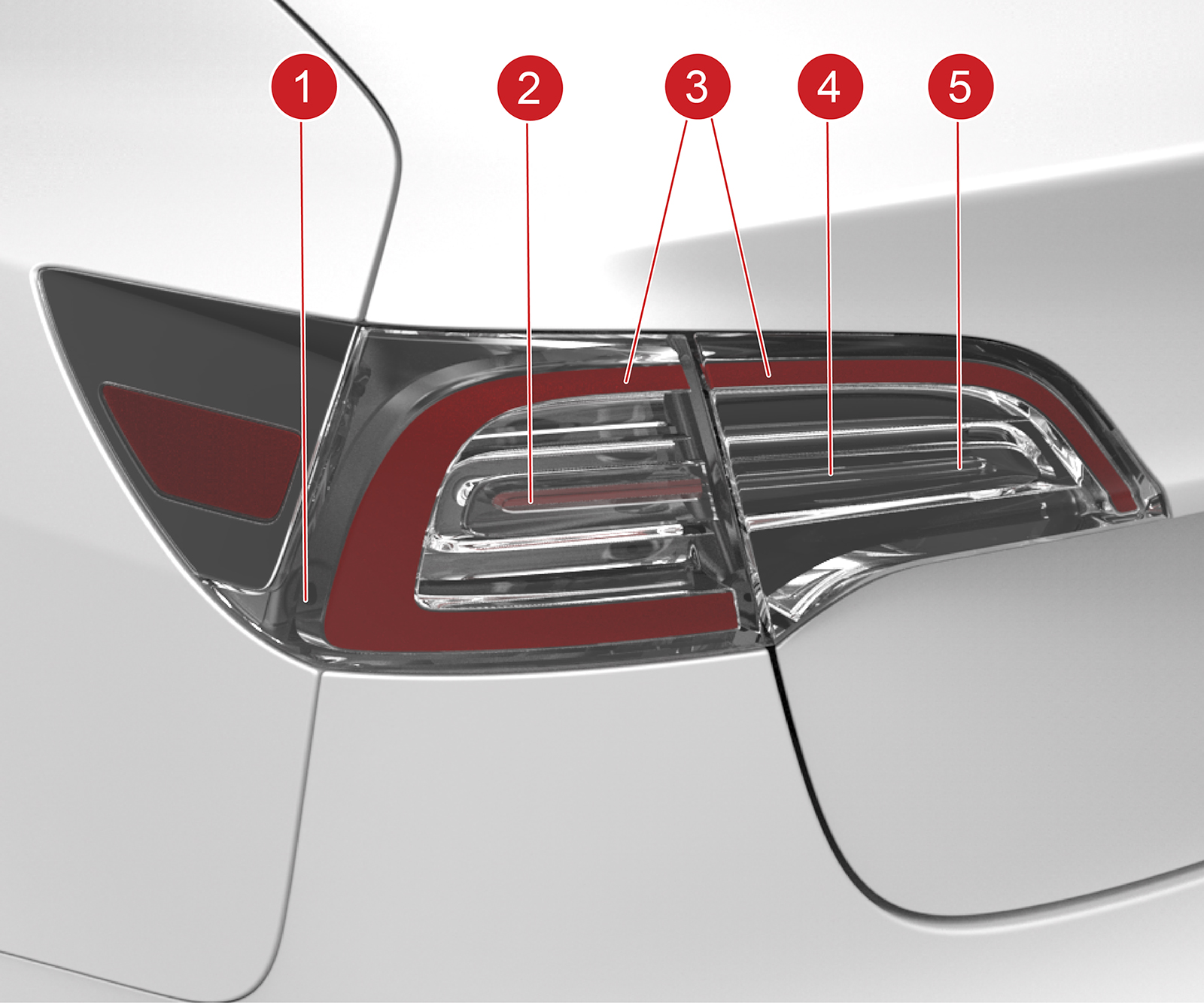 | 1. Turn 2. Stop 3. Tail 4. Reverse Note: Left-hand drive vehicles only: on the left-hand side, the reverse light is non-functioning and the rear fog light is present; on the right-hand side it is reversed. 5. Rear Fog |
