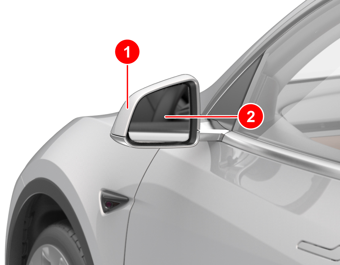 Model Y has adjustable side mirrors with a heating system to prevent moisture obstruction. Exterior mirror functionality includes auto tilt, position memory, and power folding. Movement of the mirrors can be done with the steering wheel switches and power folding is done with the UI. The Model Y exterior mirrors are equipped with dimming functionality and either an WiFi antenna or an LTE antenna.