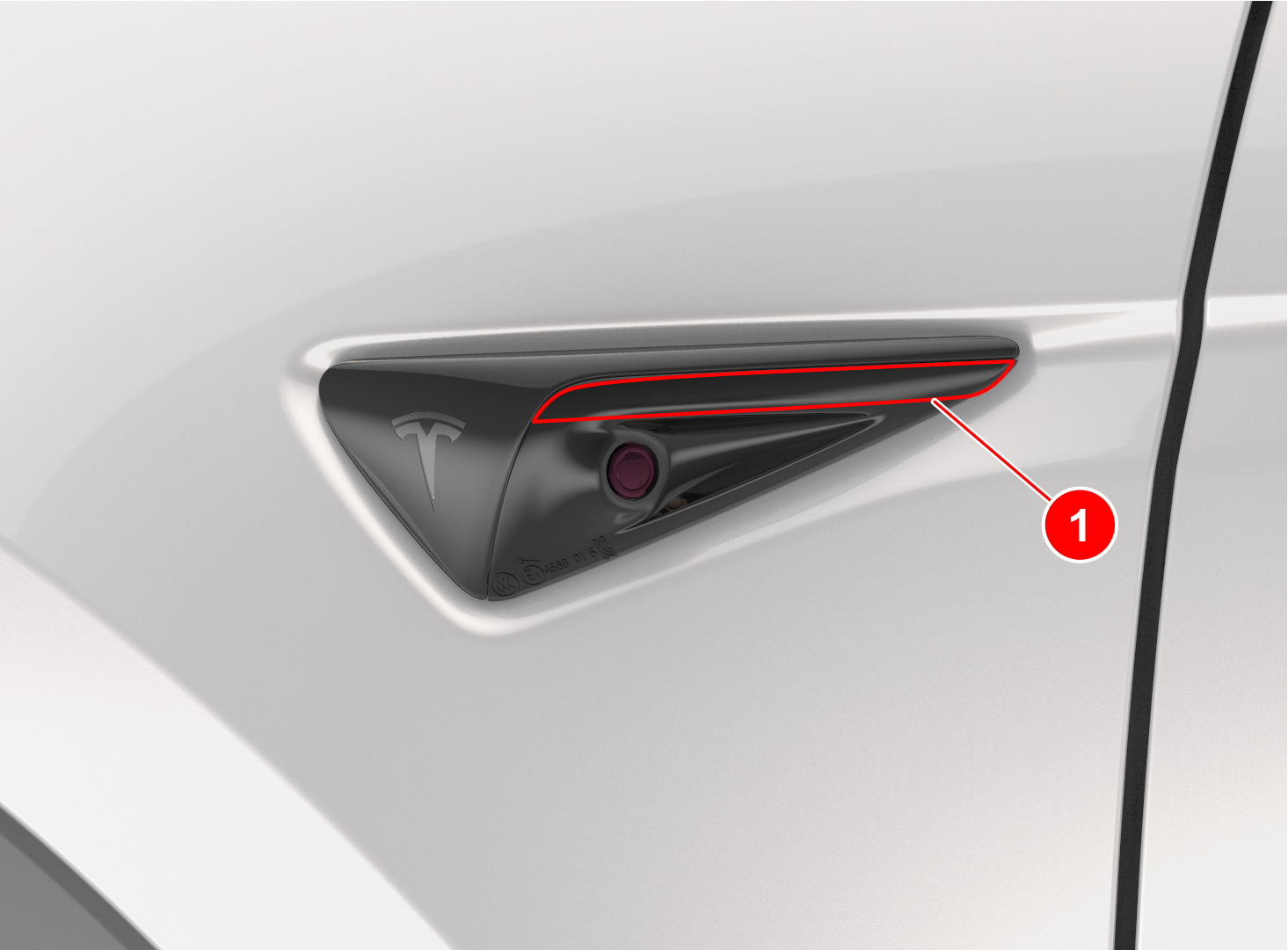 The Model Y side repeaters have an integrated camera for Autopilot functions. The LED indicator runs in the direction of travel above the camera, highlighted in the figure below. The side repeater assembly must be replaced as an assembly. Individual components (LED, Camera) are not serviceable.