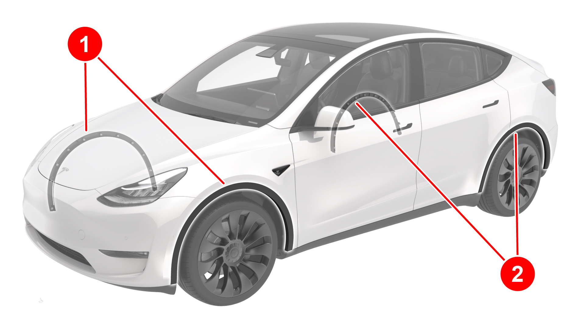 The Model Y B-pillar applique contains seals on either side which interface with the primary seals of the front and rear doors to help protect against water intrusion. The B-pillar applique houses the following components: