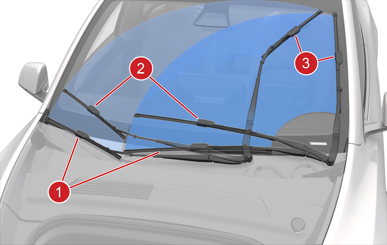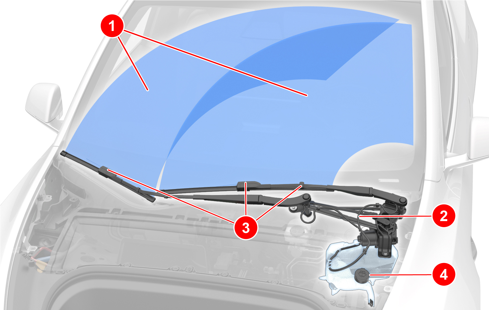 | 1. Coverage area 2. Washer hose 3. Driver and Passenger windshield wiper assembly and washer nozzle 4. Washer fluid cap |