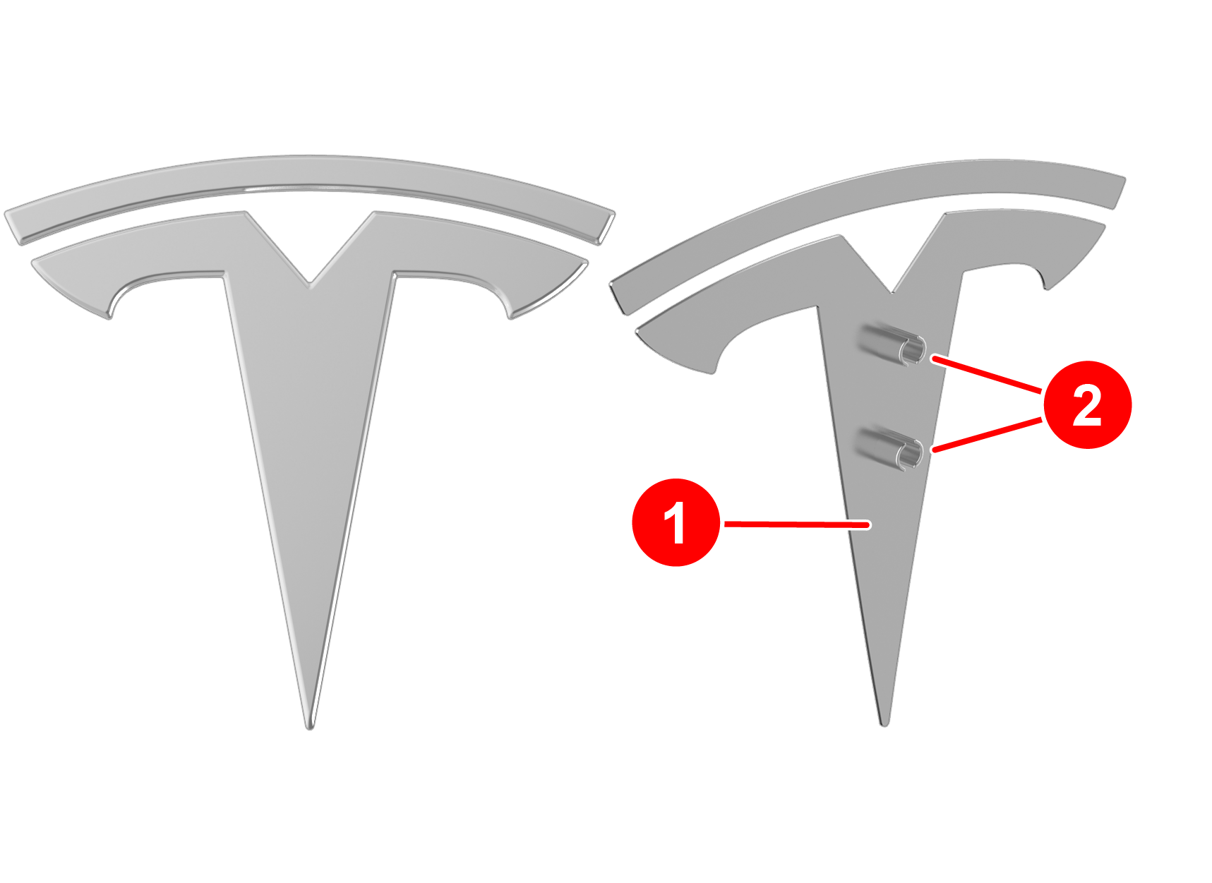 The Model Y Tesla badges are injection-molded plastic with datum pins that mate to locating holes in both the hood and liftgate.