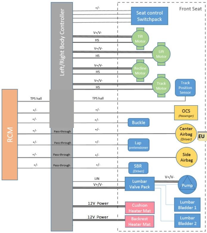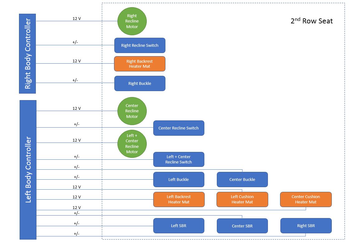First row seats have a total of four electric 12V DC brushed motors that control the different seat adjustment functionalities. This includes track, lift, tilt, and recline adjustments.