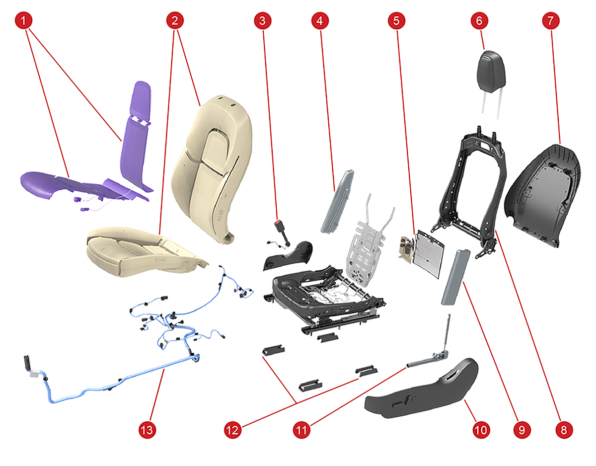 | 1. Heater pad 2. Seat foam 3. Seat belt buckle 4. Side air bag 5. Pneumatic lumbar support 6. Headrest 7. Seat back trim cover 8. Frame seat back 9. Side air bag 10. Side shield trim 11. Seat belt pretensioner 12. Seat track cover (x4 total) 13. Wire harness |