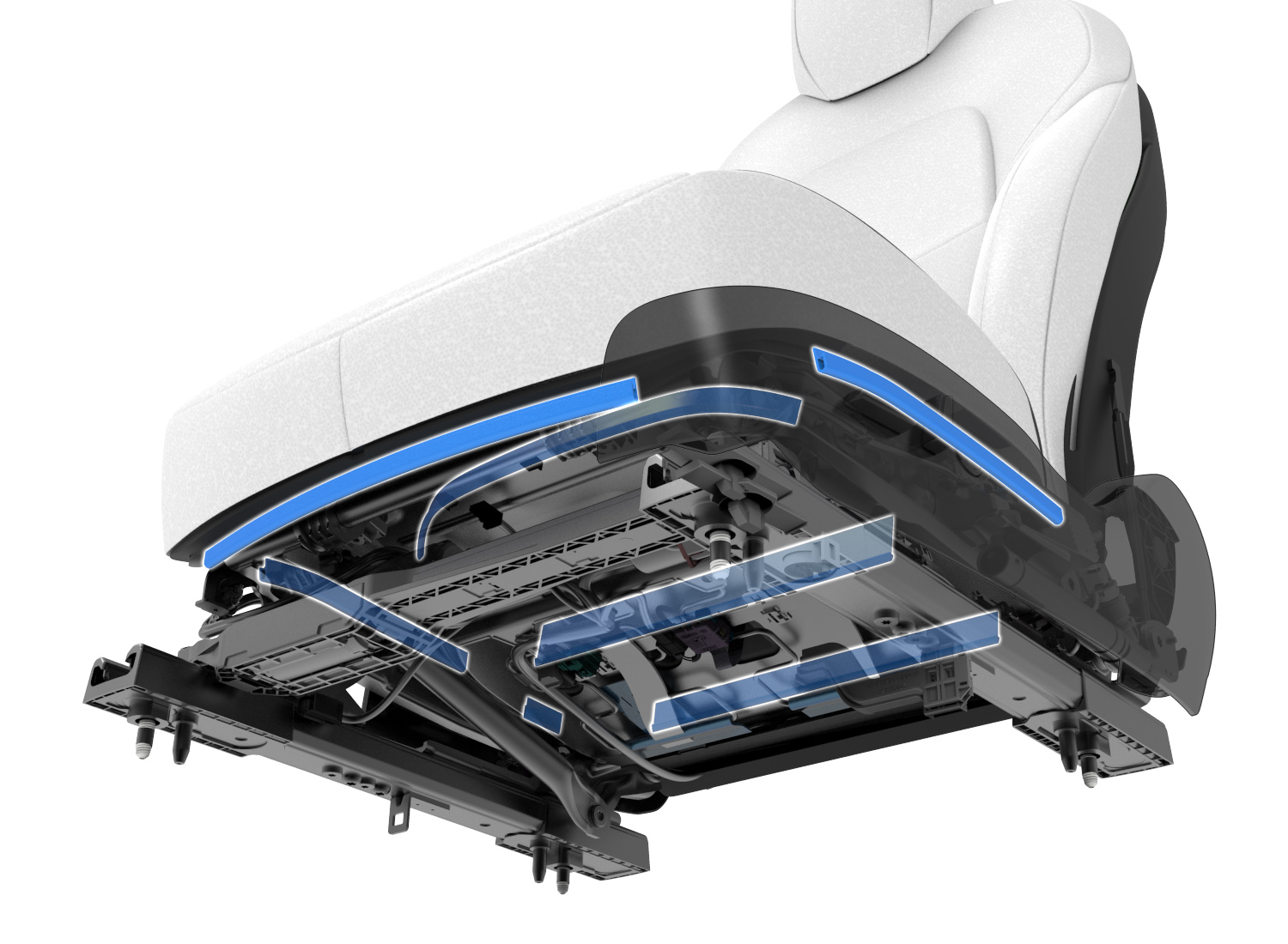 The Model Y seat lumbar system is a pneumatic 2-bladder, 4-way power system. It consists of an air pump, a valve pack, two air bladders and a lumbar flex mat.