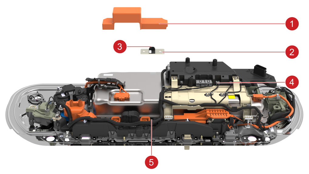 | 1. Shunt and pyro-disconnect insulator Note: The insulator may vary in shape in size according to battery revision 2. Shunt (including shunt bar and shunt PCBA) 3. Shunt connector for harness to HVC 4. Shunt to HVC harness - connection at HVC 5. Shunt to HVC harness - connection at shunt |