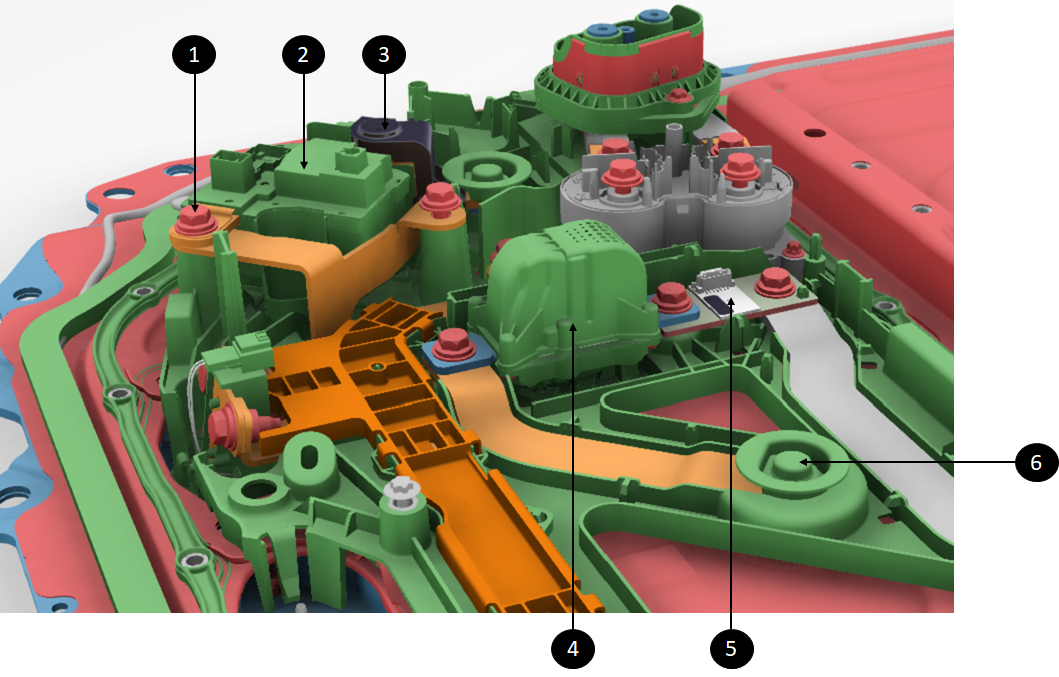 | 1. Location of the fast charge contactor assembly 2. Positive fast charge busbar 3. Negative fast charge busbar 4. Positive contactor of fast charge contactor assembly connecting positive fast charge busbar to positive DC link 5. Negative contactor of fast charge contactor assembly connecting negative fast charge busbar to negative DC link |