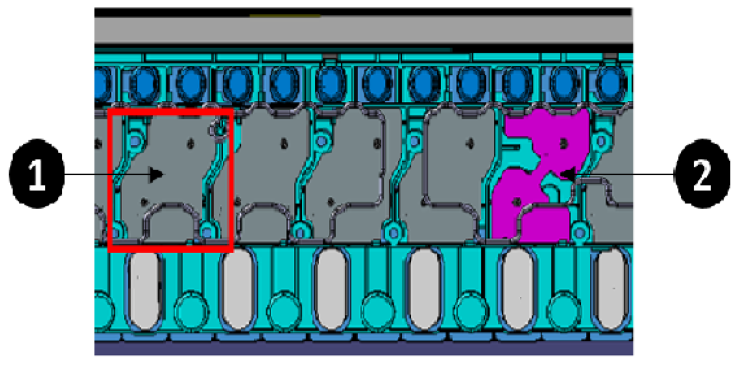 - Inlet coolant manifolds to split the coolant flow to all the cooling tubes of the HV battery.