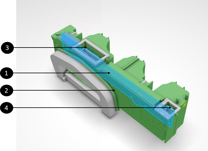 | 1. BMB (inside the housing, in blue on the rendering) 2. BMB plastic housing 3. Female connector at BMB for voltage sensor harness (VSH) 4. Female connector at BMB for daisy chain communication |