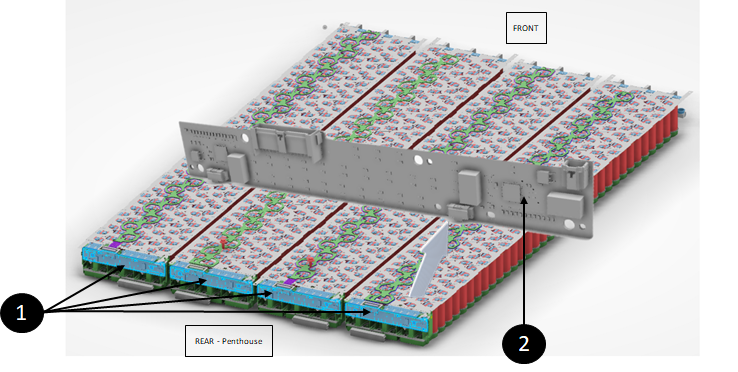 | 1. BMBs (along one side of blade cell terminals) 2. Busbar interconnects (along other side of blade cell terminals) |