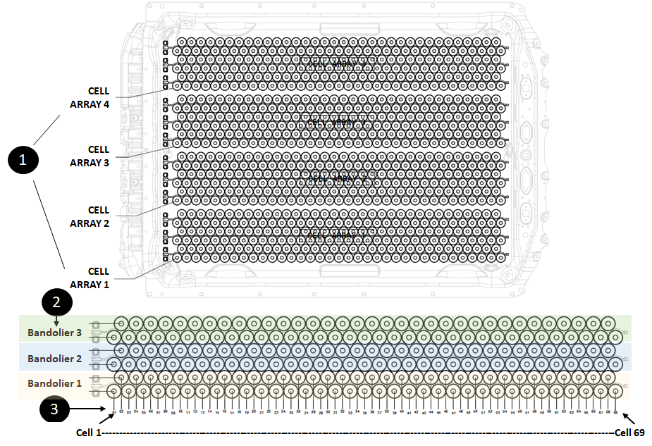 The HV battery is made of 4 independent cell-arrays installed length wise in the platter. The cell-array contains the cells of the HV battery and it is the source of energy and power for the vehicle. Each cell-arraycell-array