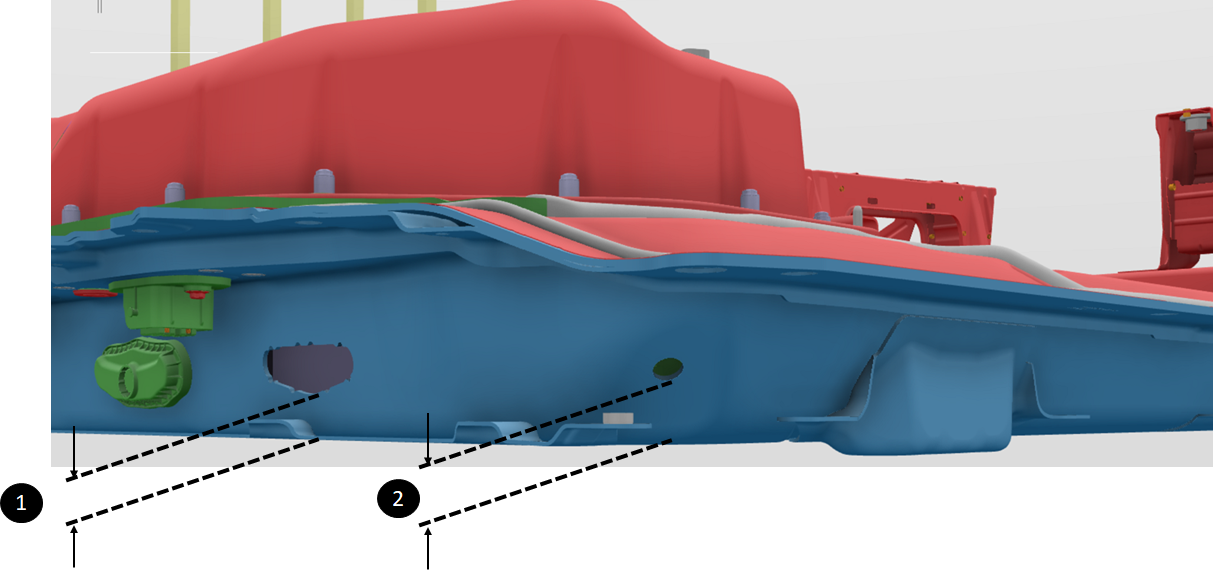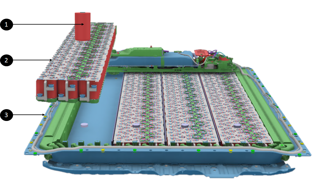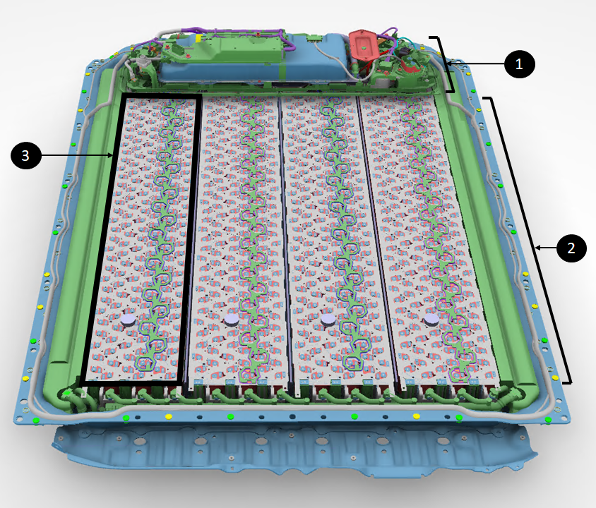 | 1. Coolant outlet out of the ancillary bay 2. Coolant inlet into the ancillary bay 3. Coolant inlet into the HV battery for the ancillary bay |