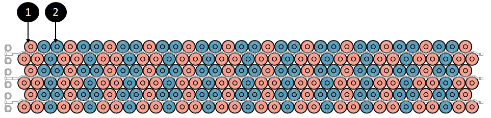 In the cell-arrays, each cell has about a third of its surface in contact with a cooling tube. The entire height of any cell contacts the cooling tube to ensure homogenous temperature along the cell.