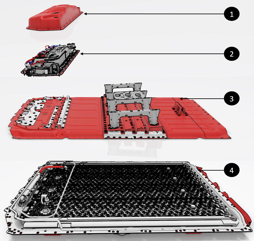 | 1. Ancillary Bay Cover 2. Ancillary Bay 3. HV battery Cover 4. HV battery Platter |
