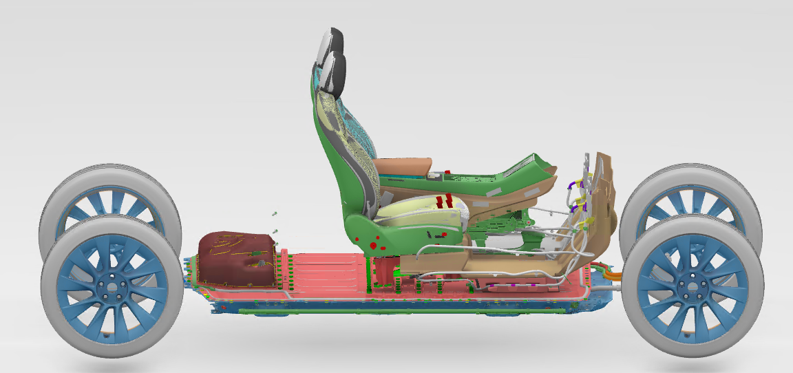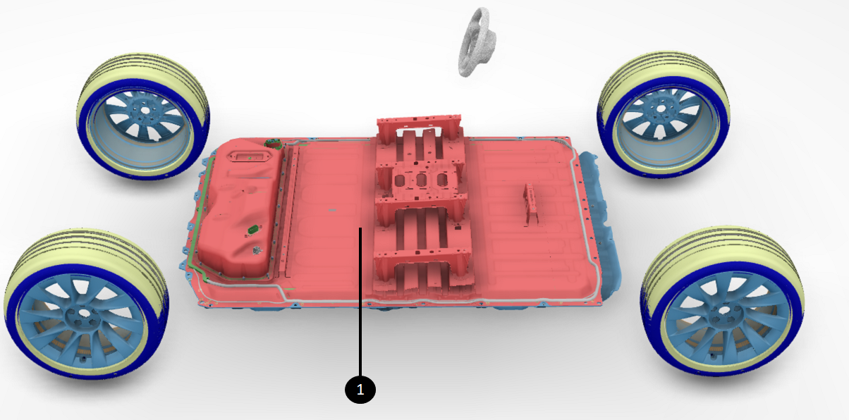 The HV battery not only provides rigidity to the chassis for vehicle dynamics and vehicle impact response, but it also acts as the floor of the vehicle. The seats, carpet, center console, harnesses, thermal duct and other interior trim are mounted directly onto the structural HV battery.