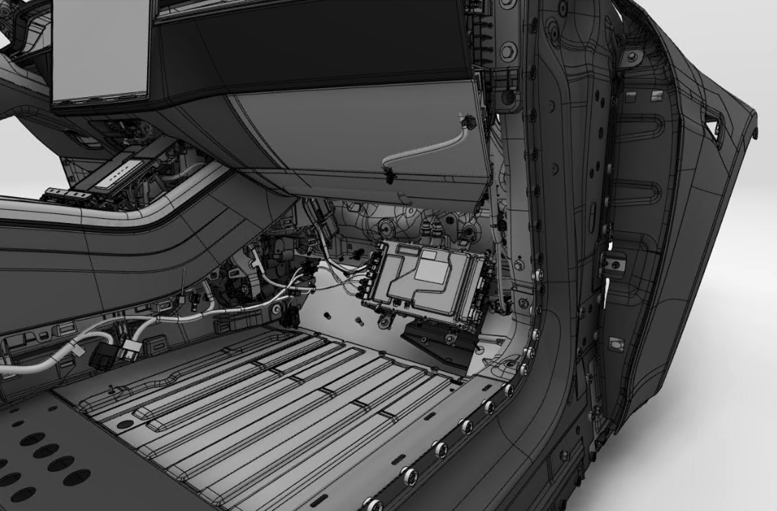 The car computer is mounted on the firewall and coolant hoses pointing into the frunk area/wet side.
