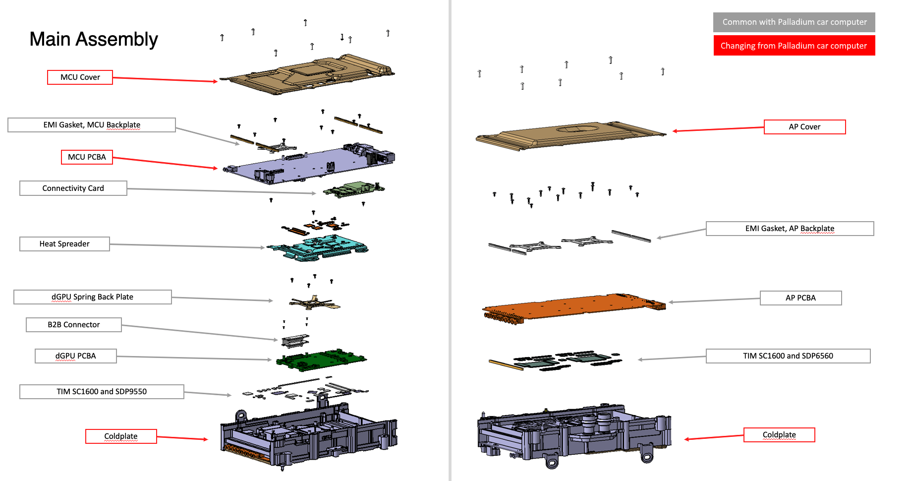 The car computer consists of a cold plate, top and bottom cover, and four printed circuit board assemblies:
