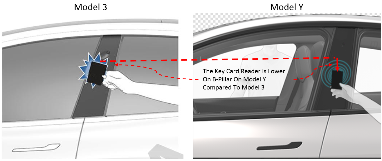 The location of the B-Pillar NFC card reader is lower on the B-pillar on the Model Y compared to the Model 3.